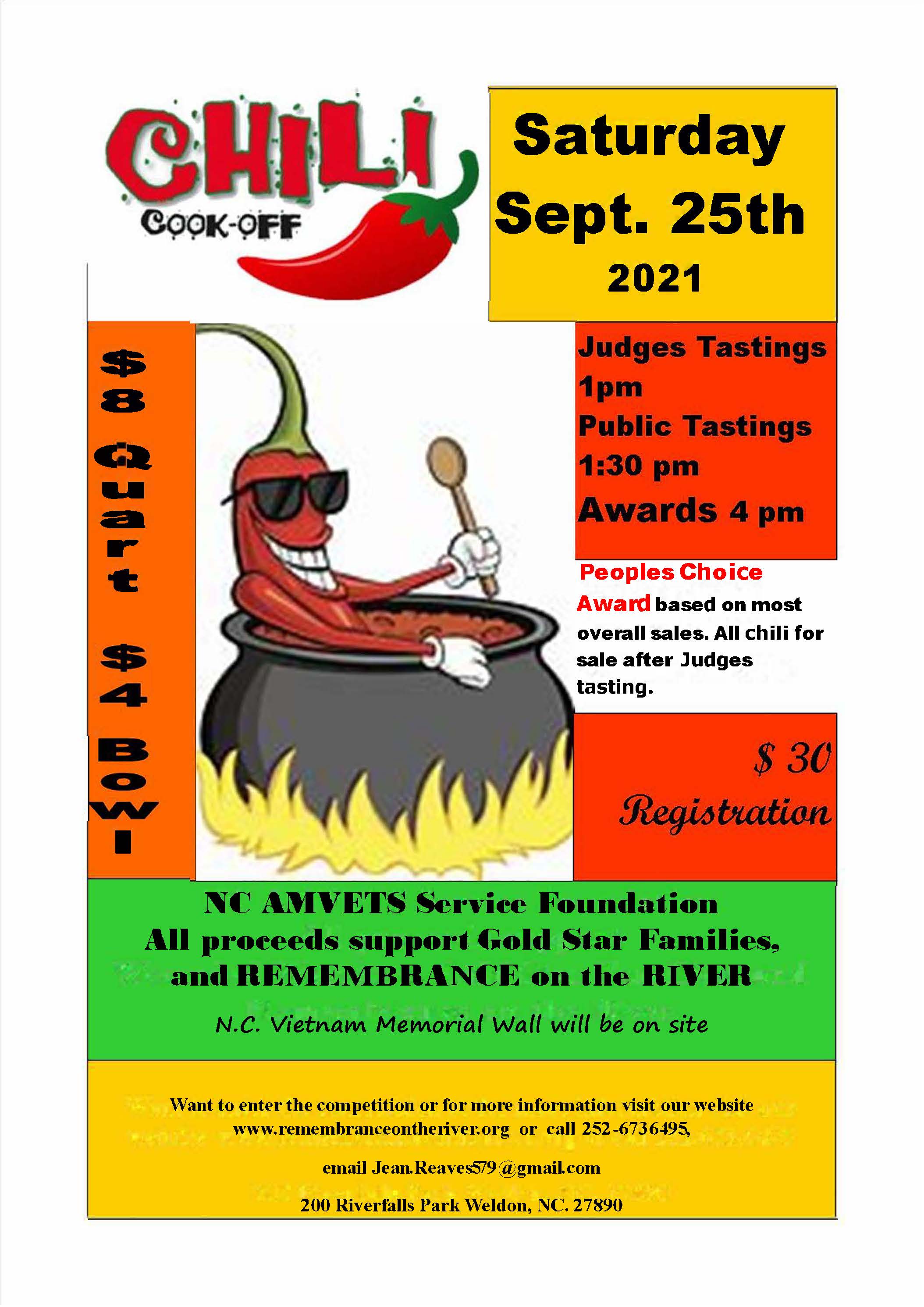 1st Annual Chili Cook-off at Riverfalls Park 200 Rockfish Lane Weldon, N.C. 27890. The NC AMVETS Service Foundation will be holding a Chili Cook-Off to benefit Gold Star Families and REMEMBRANCE on the RIVER.